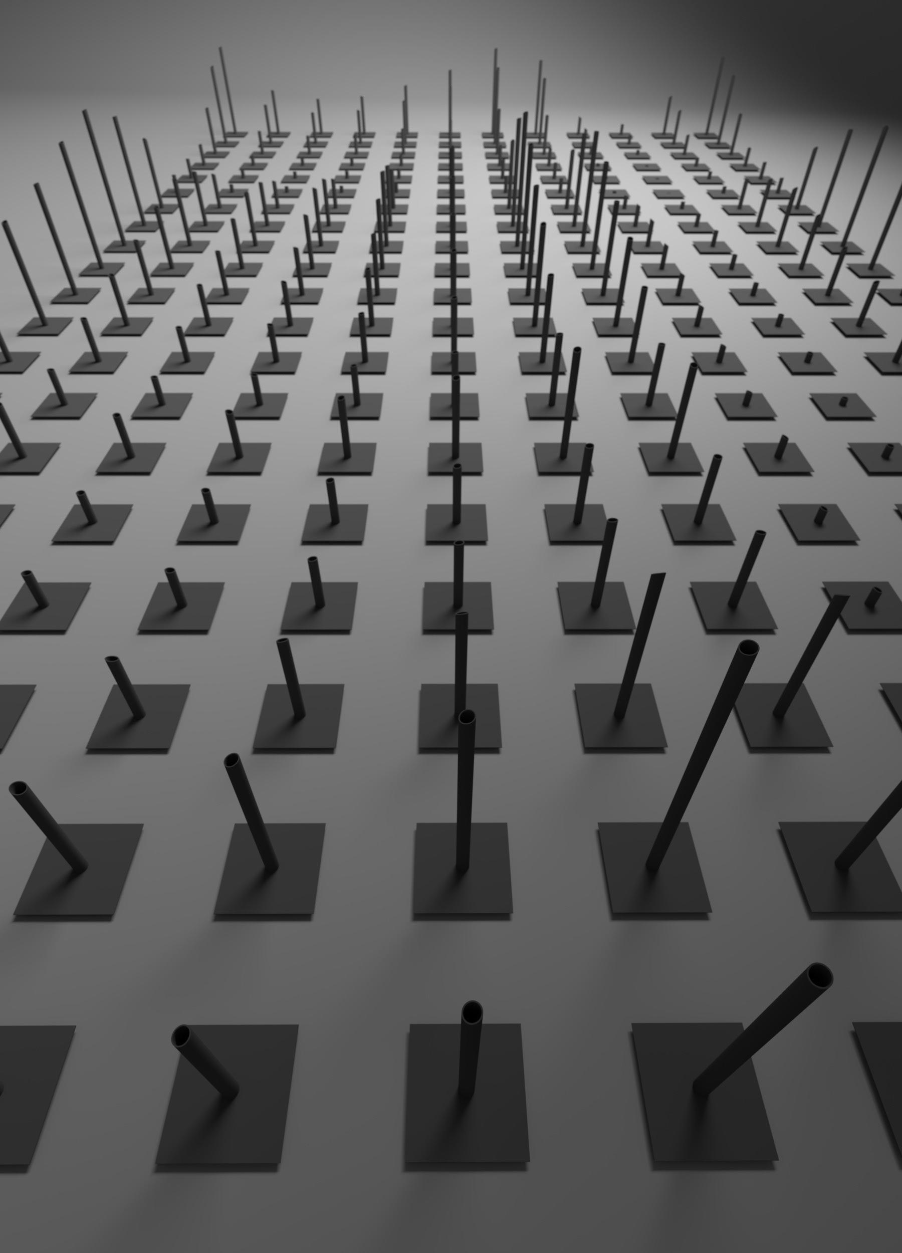 Despite this ability to carry the intricacies of the arousal, multidimensional structures are not 3D-printable and require a dimension reduction. Rather than simplifying the tensor’s four-dimensional data into a representational 3D model, required by the 3D-printing process, the artist took a radical approach of excessive reduction from four-dimensional tensor to a two-dimensional surface, a form of “data violence”, not merely simplifying it, but fundamentally changing its essence. This excessive transformation, while appearing to be a reduction, is not a loss but rather a conduit to a different type of tension -- a libidinal tension -- that creates a plane or “cutting surface”, expressing the arousal as a radical dimensional difference. Cutting across the two-dimensional matrix of identical, needle-like 3D models triggers a generative differential process, rendering each model unique, thus revealing the difference as the originating and productive of identities.