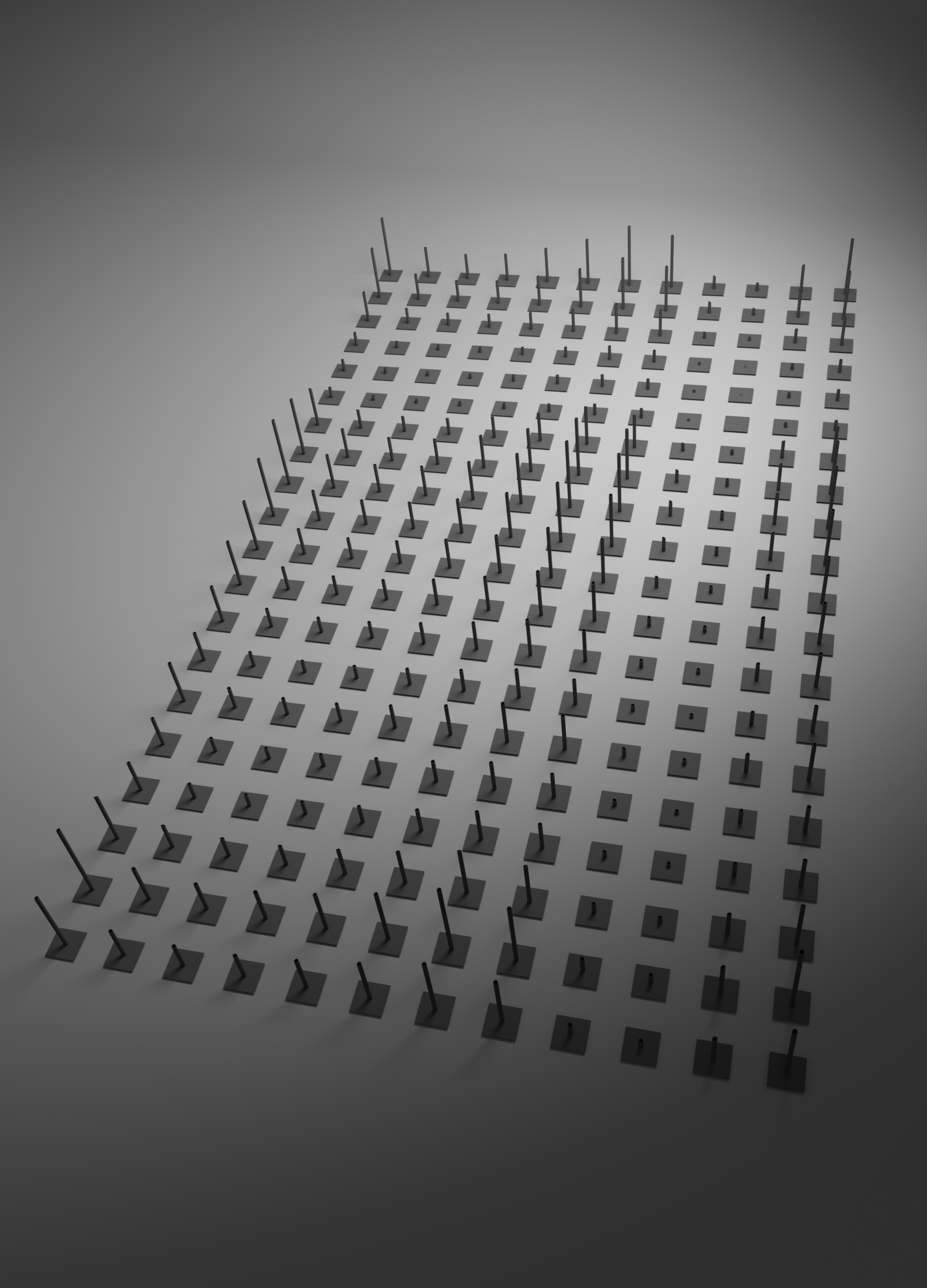 Despite this ability to carry the intricacies of the arousal, multidimensional structures are not 3D-printable and require a dimension reduction. Rather than simplifying the tensor’s four-dimensional data into a representational 3D model, required by the 3D-printing process, the artist took a radical approach of excessive reduction from four-dimensional tensor to a two-dimensional surface, a form of “data violence”, not merely simplifying it, but fundamentally changing its essence. This excessive transformation, while appearing to be a reduction, is not a loss but rather a conduit to a different type of tension -- a libidinal tension -- that creates a plane or “cutting surface”, expressing the arousal as a radical dimensional difference. Cutting across the two-dimensional matrix of identical, needle-like 3D models triggers a generative differential process, rendering each model unique, thus revealing the difference as the originating and productive of identities.