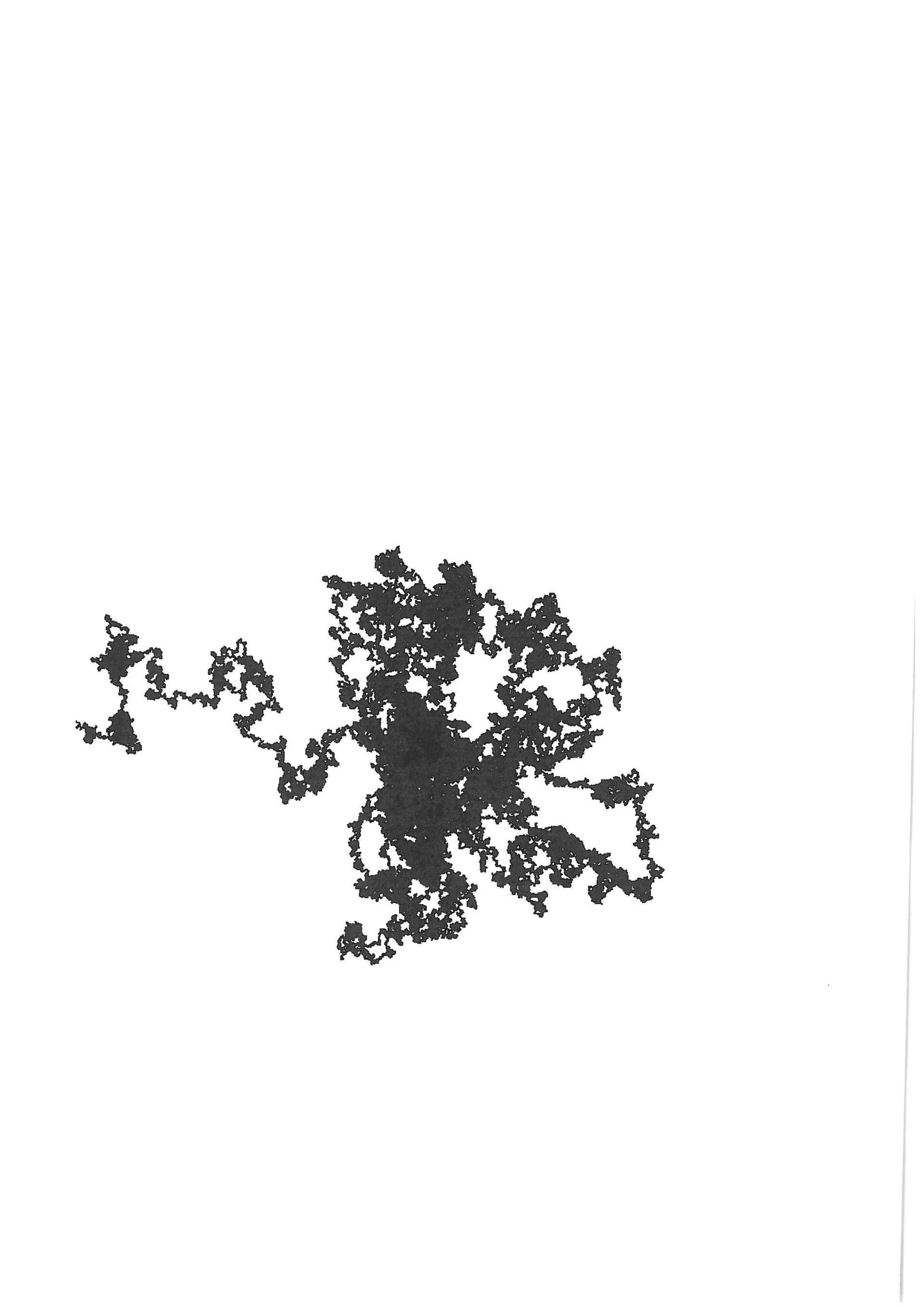 Since the pixel values in this algorithm take only values of zero and one (zero indicating that the random walk did not cross that particular pixel and one that it did), the drawn path is not simply a line, but both line and surface, due to the black blocks of pixels indicating areas that random walk crossed multiple times. This area resides in the fractal dimension, topologically between one and two dimensions. Fractal in nature, keeping their structural integrity on every level of magnification, these originals are not fragments that would form a whole or totalising image when assembled since they produce and reproduce endlessly. While all the drawings look visually different, each carries the same statistical properties --- like circumference or area covered, constituting infinite originals.